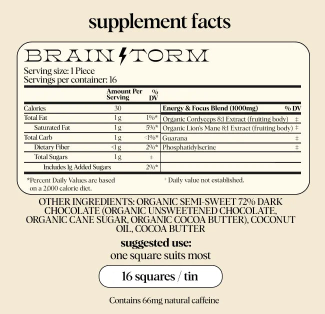 Alice Brainstorm Mushroom Chocolate is expertly formulated with a powerful blend of natural ingredients, including lion's mane extract (fruiting body), cordyceps extract (fruiting body), guarana, and phosphatidylserine. These premium ingredients are known for their ability to enhance cognitive function, improve memory, and sustain energy levels throughout the day.